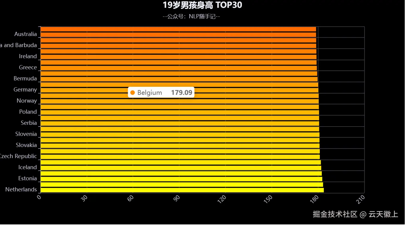 title_opts=opts.TitleOpts(title="19岁男孩身高 TOP30", subtitle="--公众号:NLP随手记--", pos_left="center"),