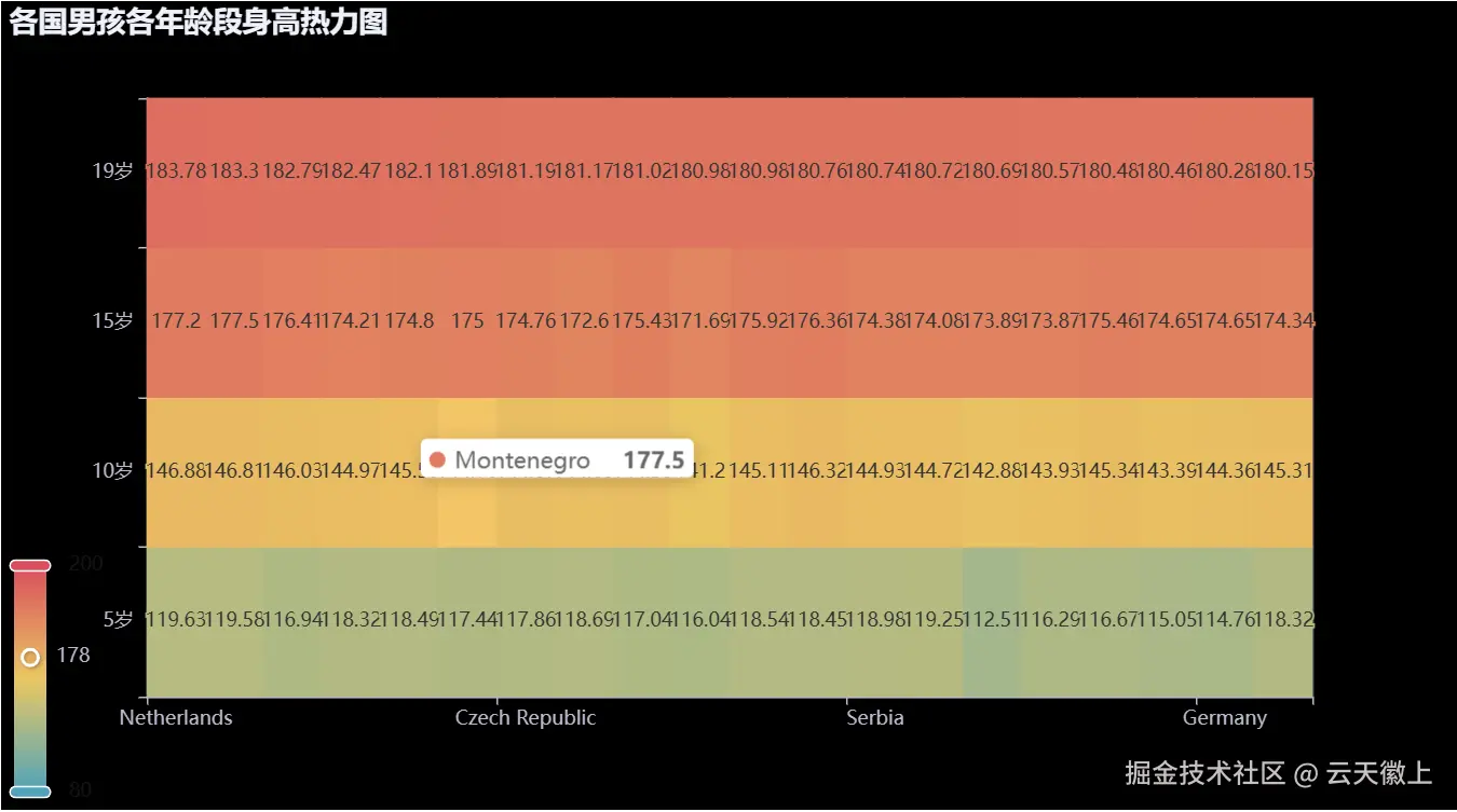 分析: 热力图可以帮助我们直观地看到不同国家男孩在不同年龄段的身高分布情况,颜色越深表示身高越高。