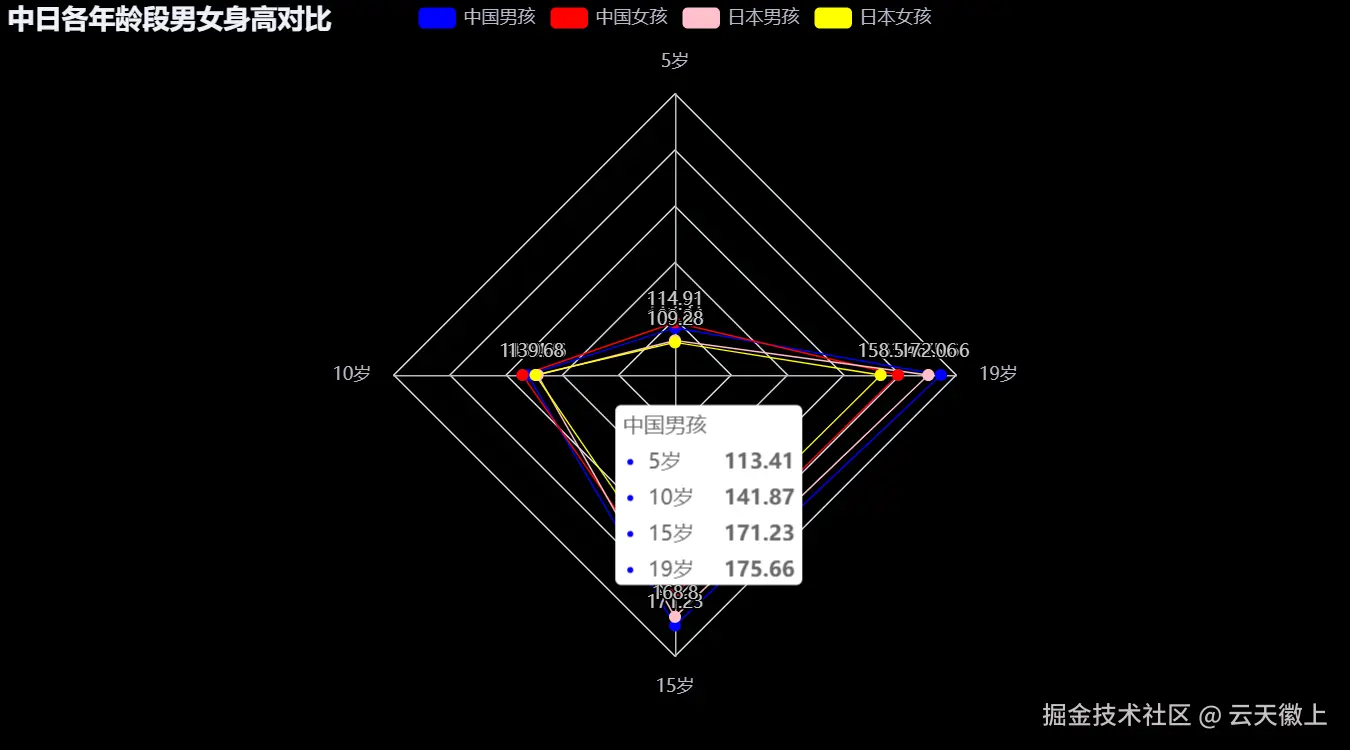 分析: 雷达图可以帮助我们直观地看到中国和日本在不同年龄段的男女身高差异。