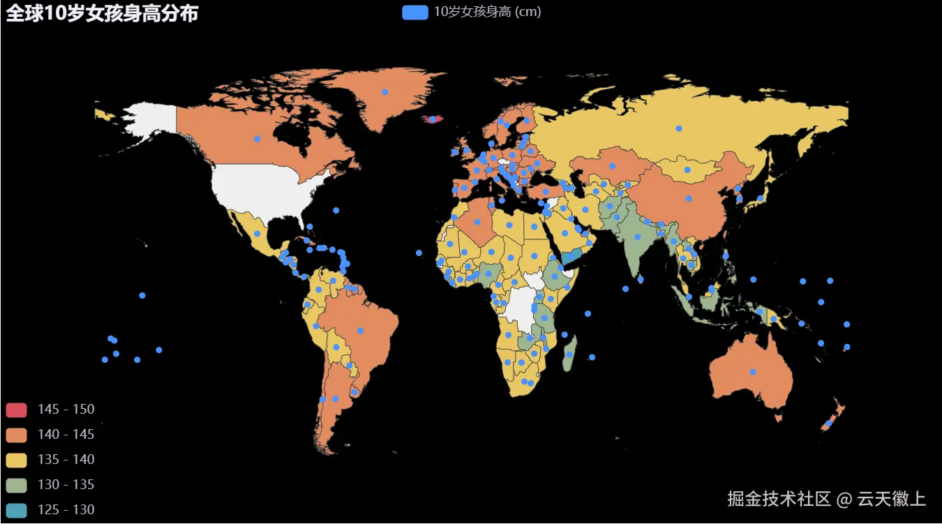 分析: 地图可以帮助我们直观地看到全球不同国家 10 岁女孩的身高分布情况,颜色越深表示身高越高。