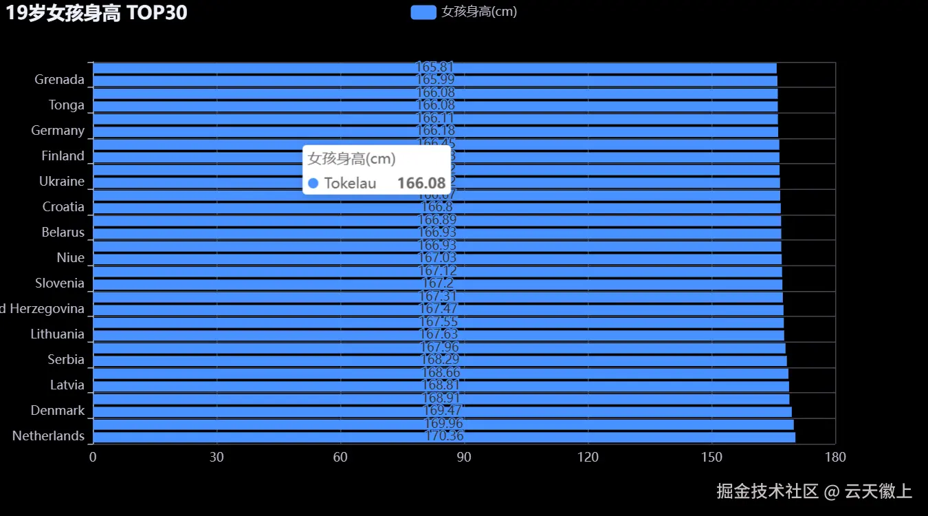 接下来,我们查看 19 岁女孩平均身高最高的 30 个国家。