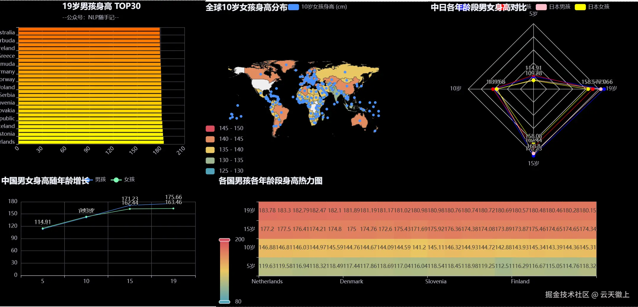 通过上述可视化分析,我们可以清晰地看到全球不同国家和年龄段的身高分布情况。从男女身高差异到各国的身高对比,再到年龄增长趋势,这些图表为我们提供了丰富的信息。希望这篇文章能帮助你更好地理解和分析全球身高数据。