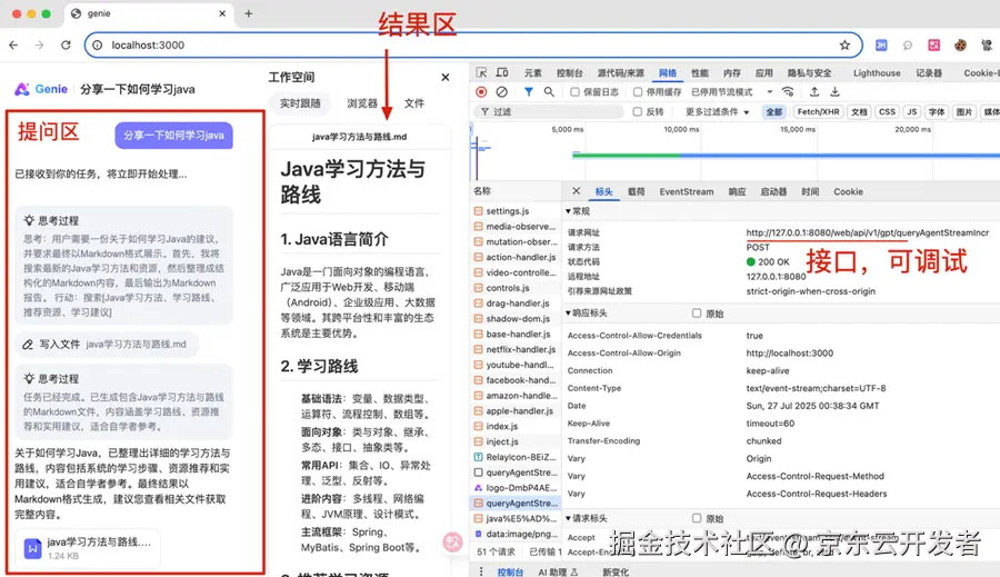 好在,京东开源了一套通用且轻量可扩展的多智能体框架 joyagent-jdgenie,这样的一套东西,可以直接开箱即用。目前提供了 Docker 部署、本地脚本部署,还可以 IntelliJ IDEA 打开项目,直接启动 SpringBoot 程序进行代码调试。