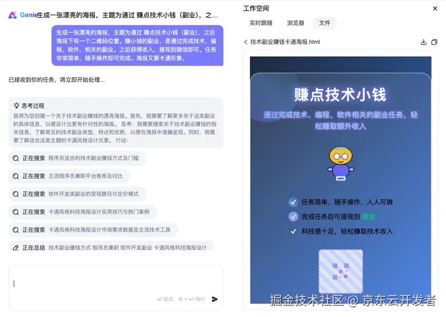 •整个过程,让 Ai Agent 根据我的诉求进行大量资料的检索和内容的创作,尤其是京东这套 Ai Agent 会检索出非常全面的实时资料,之后在经过一轮轮的分析和设计给出最终效果。