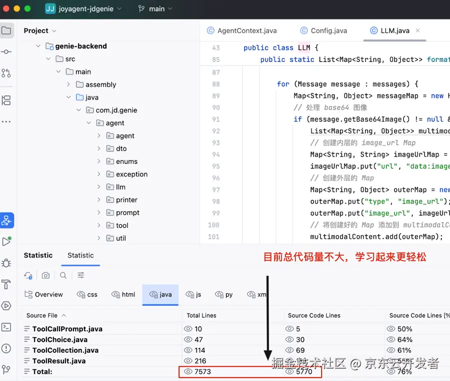 也就是说,JoyAgent 既可以满足企业使用(拿过来就部署),也能让学习 Ai Agent 开发的程序员伙伴,上手运行和调试,还可以迭代出新的功能。我看了,目前工程涉及了 Java、Python、TypeScript,Java 是主要的大头,有核心代码 0.57k 行(刚开源还不算多),正式可以好上手学习的时候。