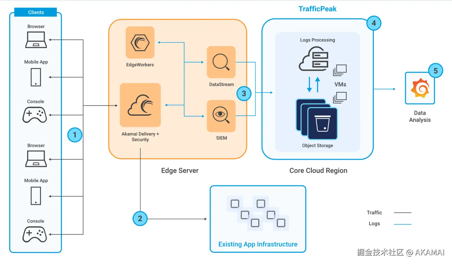 - 边缘服务器:接收、处理和服务客户端请求的边缘基础设施。在此工作流中,边缘服务器活动会被记录并发送到TrafficPeak以供观察。