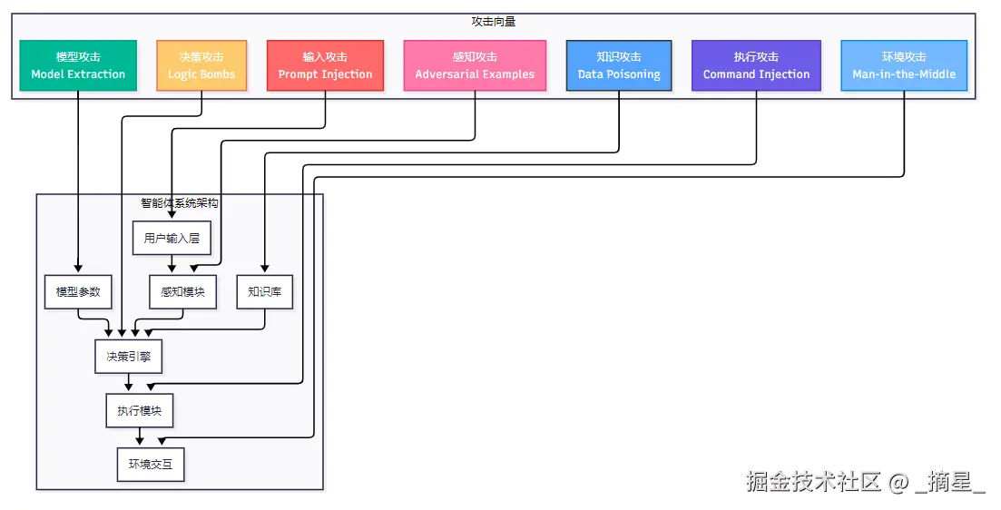 智能体系统的攻击向量可以通过以下架构图进行可视化分析:图1 智能体系统攻击向量分析图