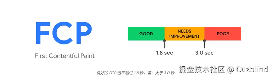 首次内容绘制时间,指浏览器首次绘制页面中至少一个文本、图像、非白色背景色的canvas/svg元素等的时间,代表页面首屏加载的时间点。