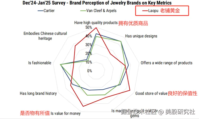 如今的消费者对经典文化、经典审美具备更好的鉴赏能力,也对讲述传承故事的文化品牌具有“时光滤镜”与天然信任感。比如,摩根士丹利报告提出,消费者认为老铺黄金比卡地亚和VCA拥有更长的品牌历史,即使它是奢侈品领域的后起之秀。这种感觉实际上来自中国源远流长的文化。