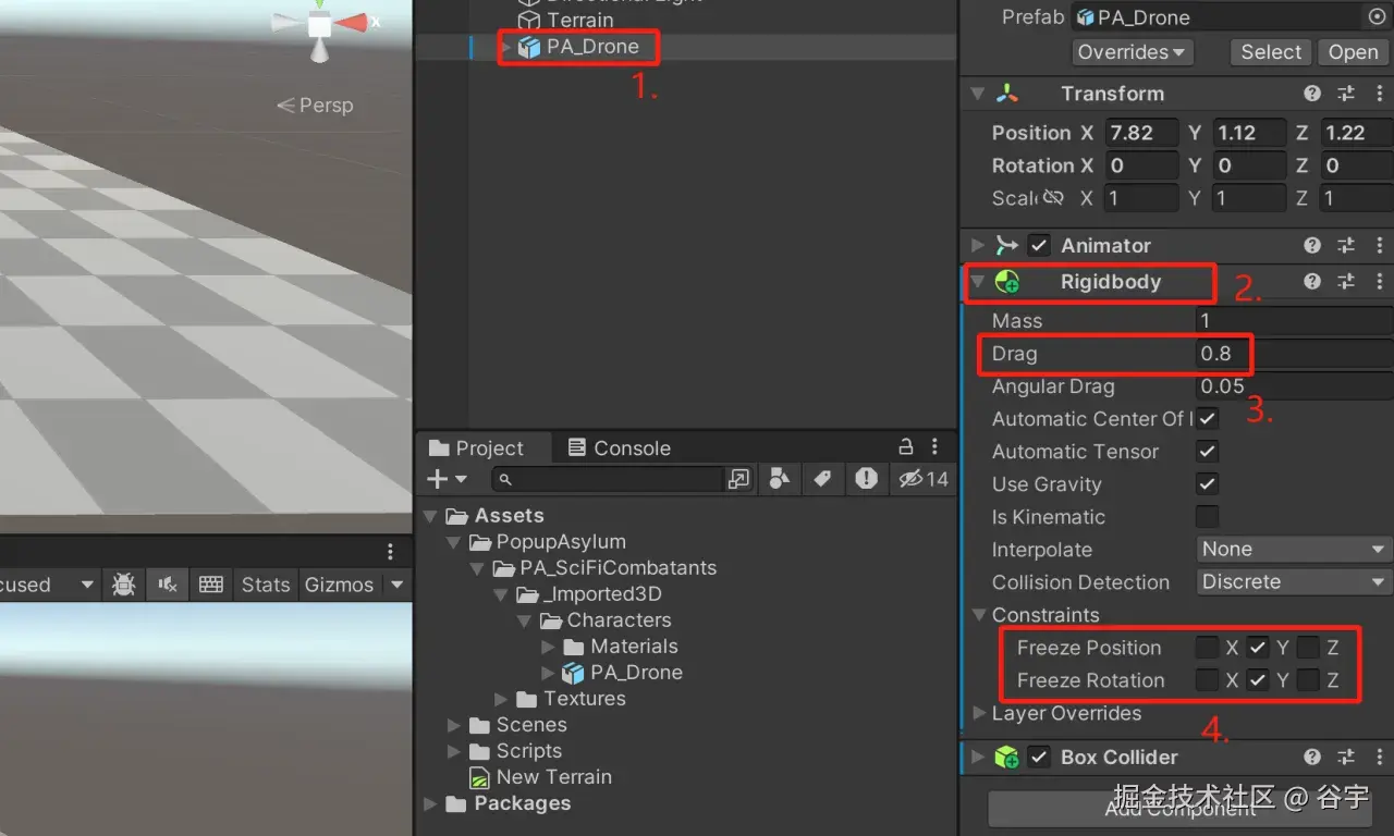 1.我们需要为我们的飞船添加刚体组件,并且设置摩檫力为0.8,再冻结刚体组件的Y轴,避免飞船移动时受重力影响产生旋转。