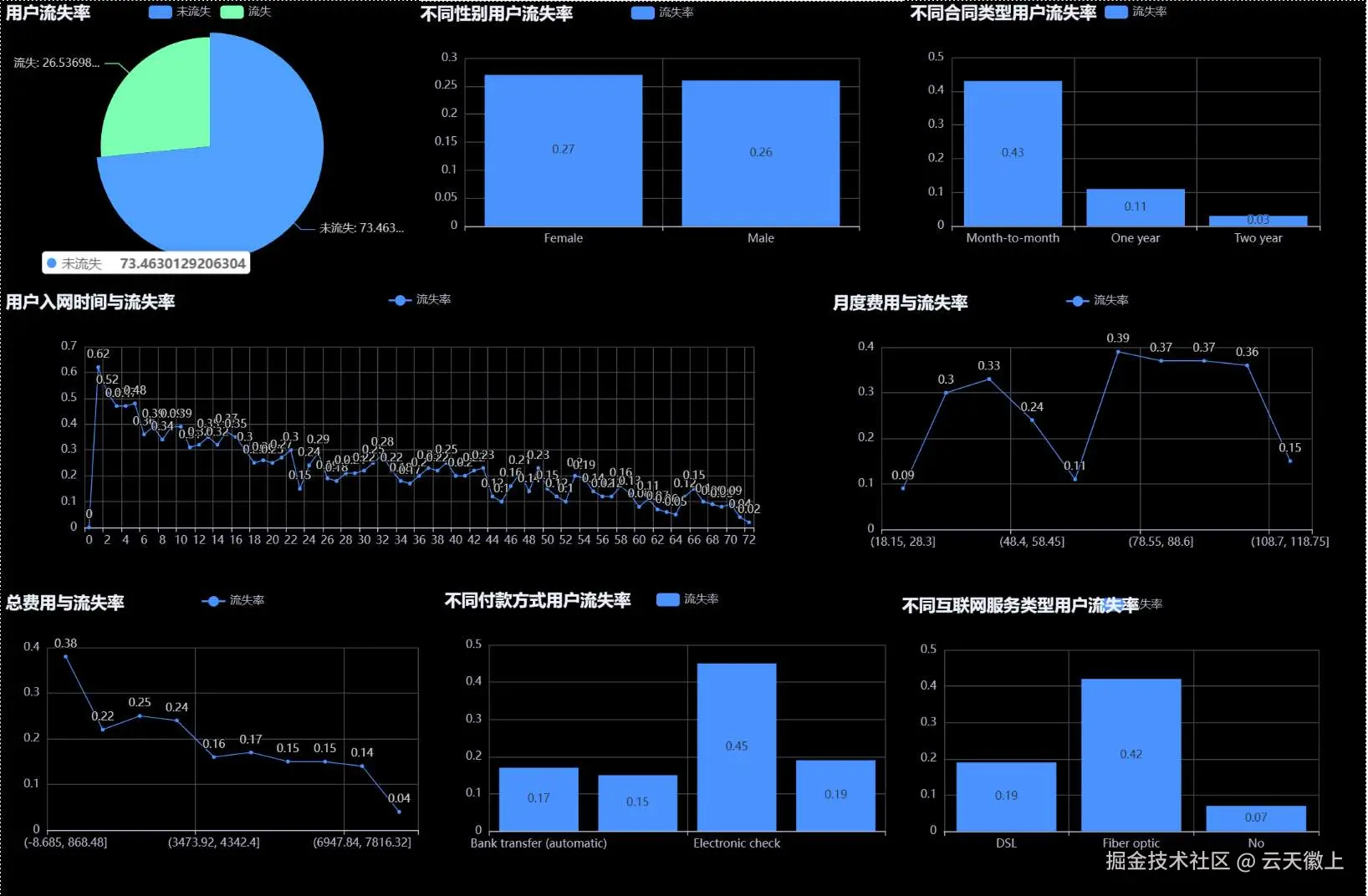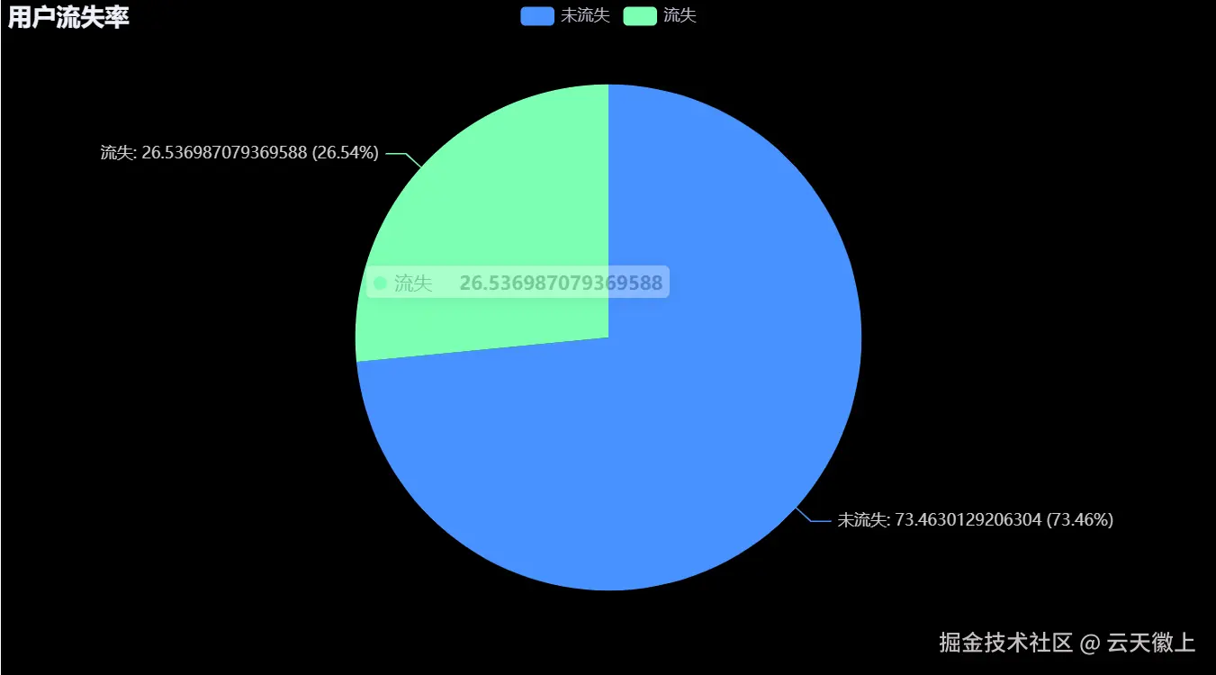分析: 从饼图中可以看到,约 26.5% 的用户已经流失,这是一个值得关注的问题。