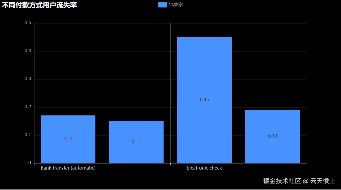 - 付款方式:使用电子支票付款的用户流失率最高,而使用银行转账付款的用户流失率最低。