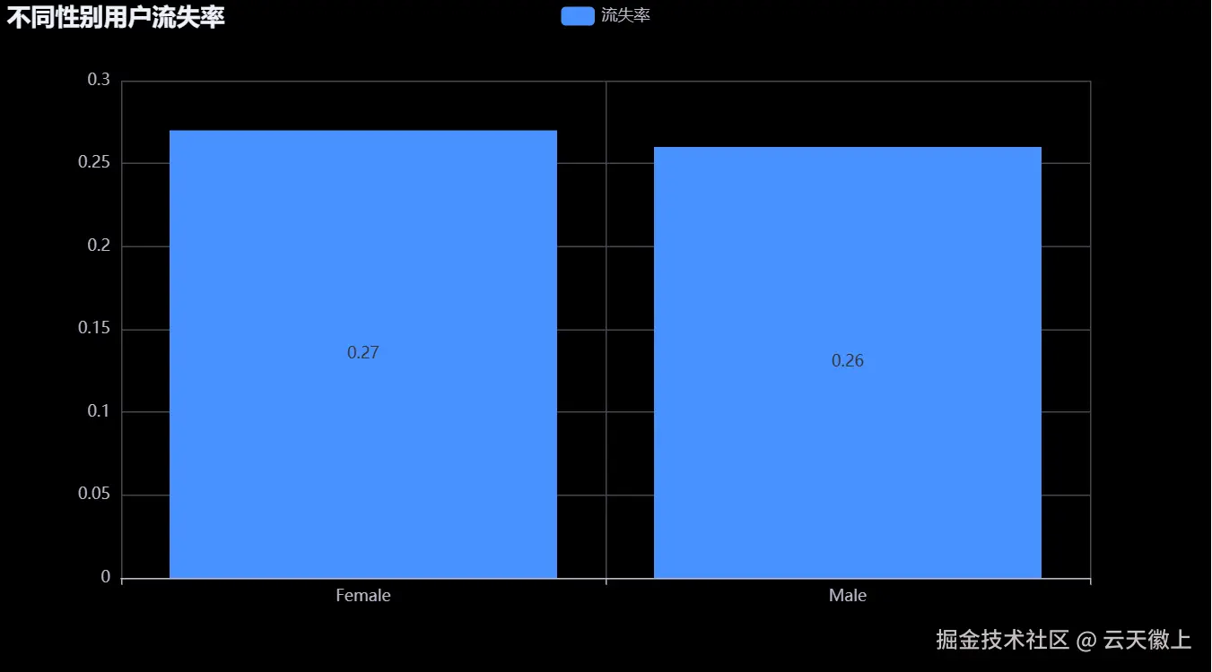 分析: 从柱状图中可以看到,女性用户的流失率略高于男性用户。