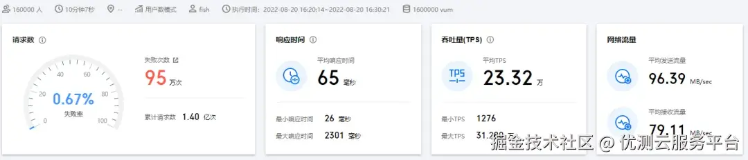 吞吐量度量了单位时间内被测服务可以处理多少请求,所以是服务性能的重要指标。压测过程中吞吐量通常使用TPS进行度量。什么是TPS呢?TPS的全称是Transaction Per Second,也就是被测服务每秒处理的事务数TPS的计算方式,是用压测时间段内的总事务数除以压测总时长秒数,即可得到每秒处理事务数。在压测过程中,优测压测平台会每秒计算一次当前这一秒的TPS,压测过程结束后,其中最小和最大的即最小和最大TPS,求均值即可得出平均TPS。