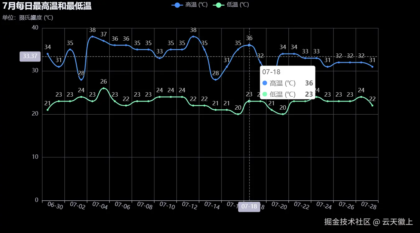 接下来,我们查看7月份每天的最高温和最低温。
