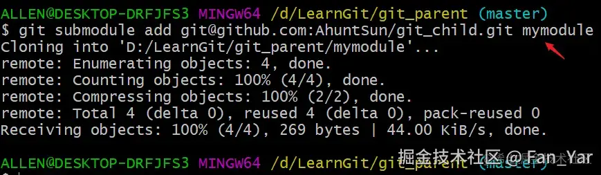 随后父版本库通过下述指令,拉取远程子库,与本地父仓库