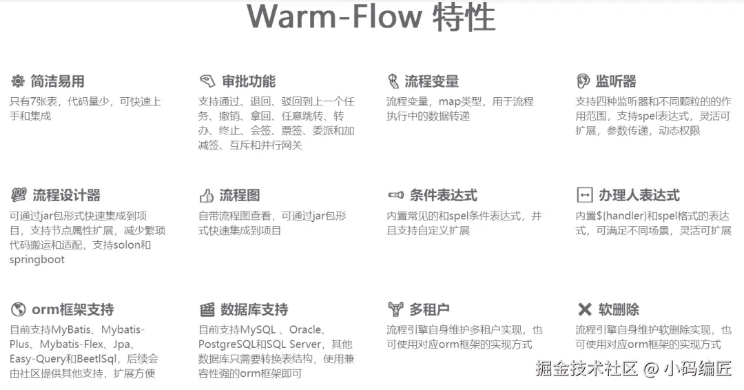 Warm-Flow、工作流引擎、Spring Boot、Solon、流程设计器、ORM框架、数据库支持、多租户、软删除、开源协议