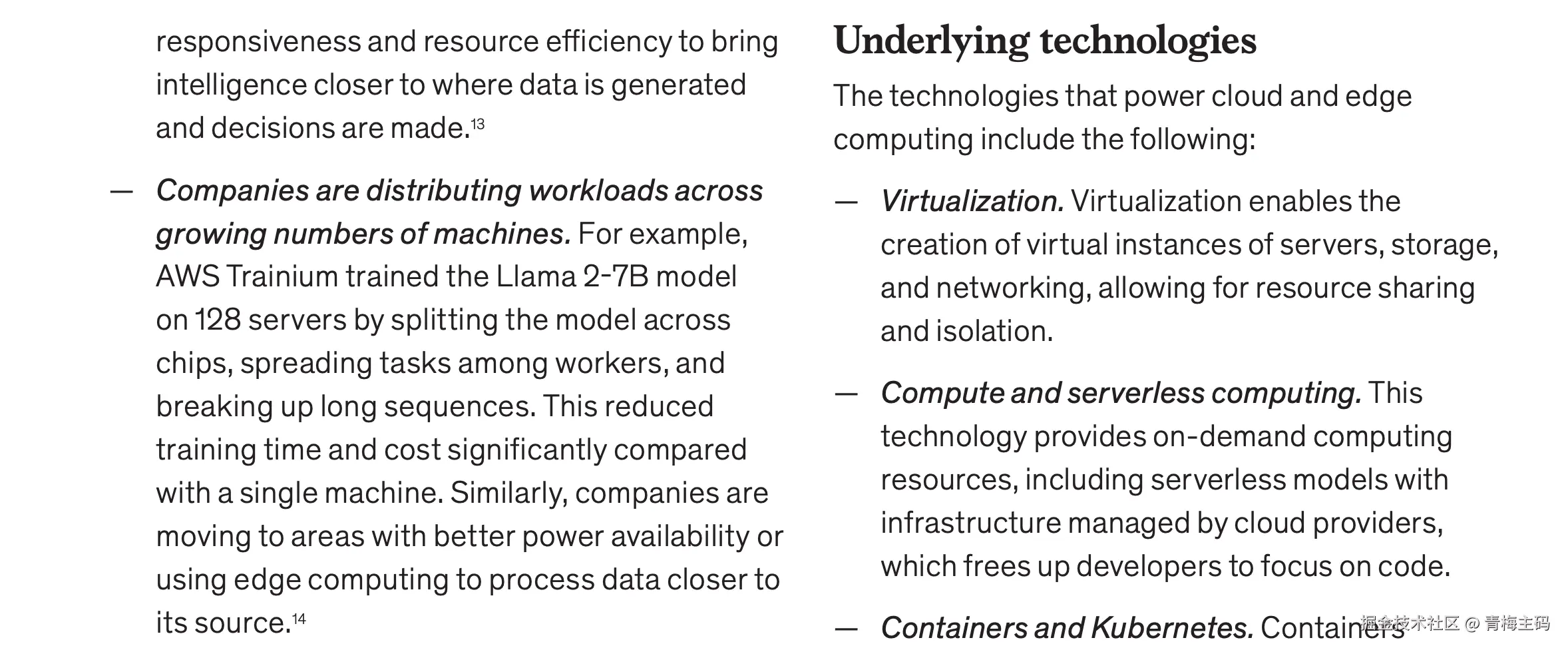 云与边缘计算( Cloud and Edge Computing )通过分布式工作负载优化性能,满足 AI 对低延迟和数据安全的需求(Adoption score: 4)。2024 年, AI 驱动的数据中心需求激增,促使企业优化冷却系统和分布式训练。例如, AWS Trainium 通过 128 台服务器训练 Llama 2-7B 模型。人才需求波动,软件工程师岗位在 2024 年回落至 2021 年水平。