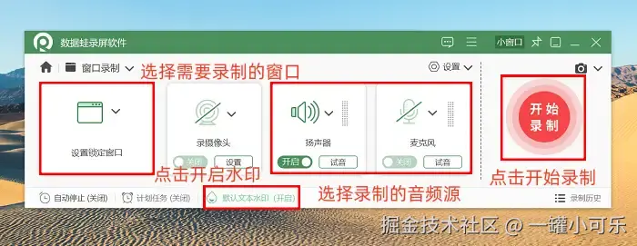 步骤2:选好模式后,你可以用鼠标随便框选要录的窗口,就像给窗户裁个框一样方便!对了,也别忘了调音频设置。是只录电脑声音,还是连麦克风的声音一起收,都能自己定。要是想给视频加个专属标记,点击下面的 “文字水印” 就能加上啦。全都弄好,点击 “开始录制” 就会大功告成啦。