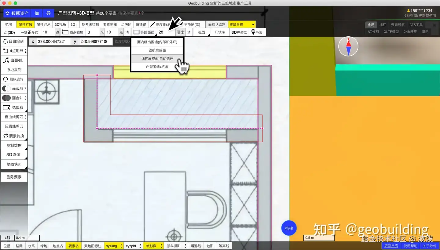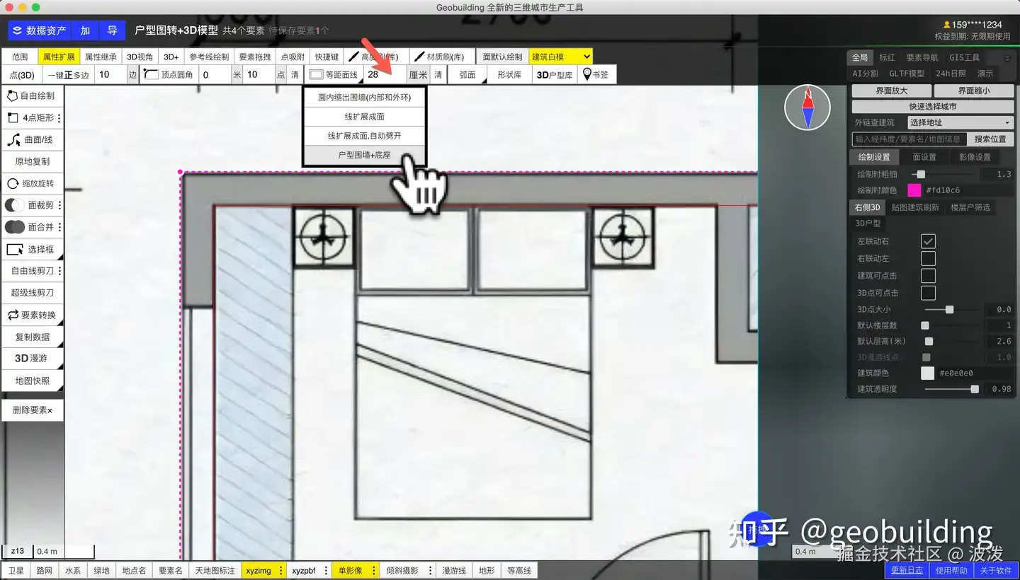 点击顶部工具【等距面线】设置线扩展宽度。点击生成围墙和户型底座。