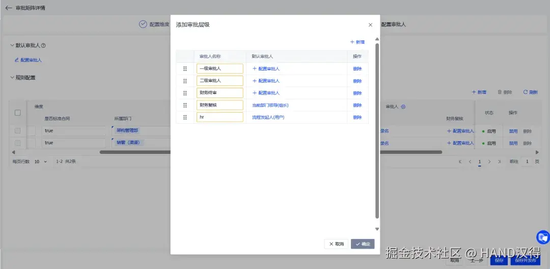 审批矩阵维护时,支持同一维度(如部门、职级、项目类型)维护多组审批人,提升配置效率,避免重复配置