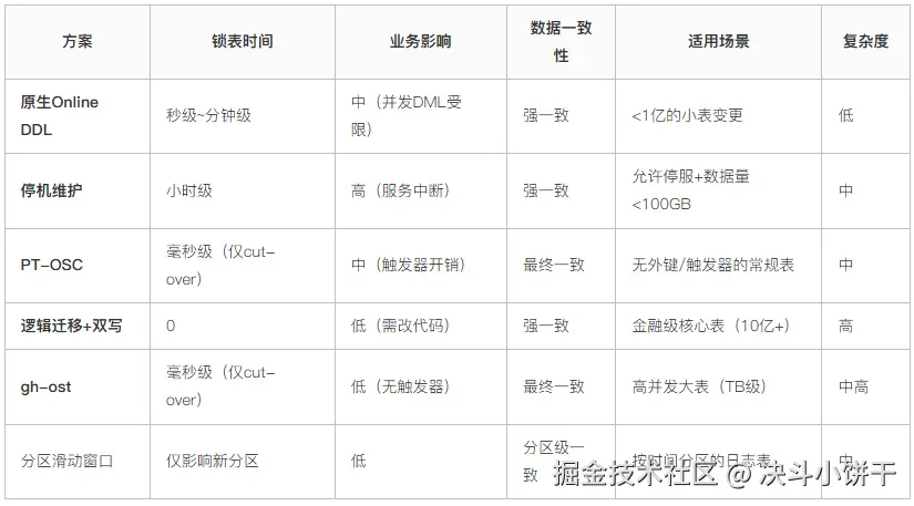 触发器方案(如pt-osc) :在源表上创建INSERT/UPDATE/DELETE触发器,在同一事务内将变更同步到影子表。痛点: