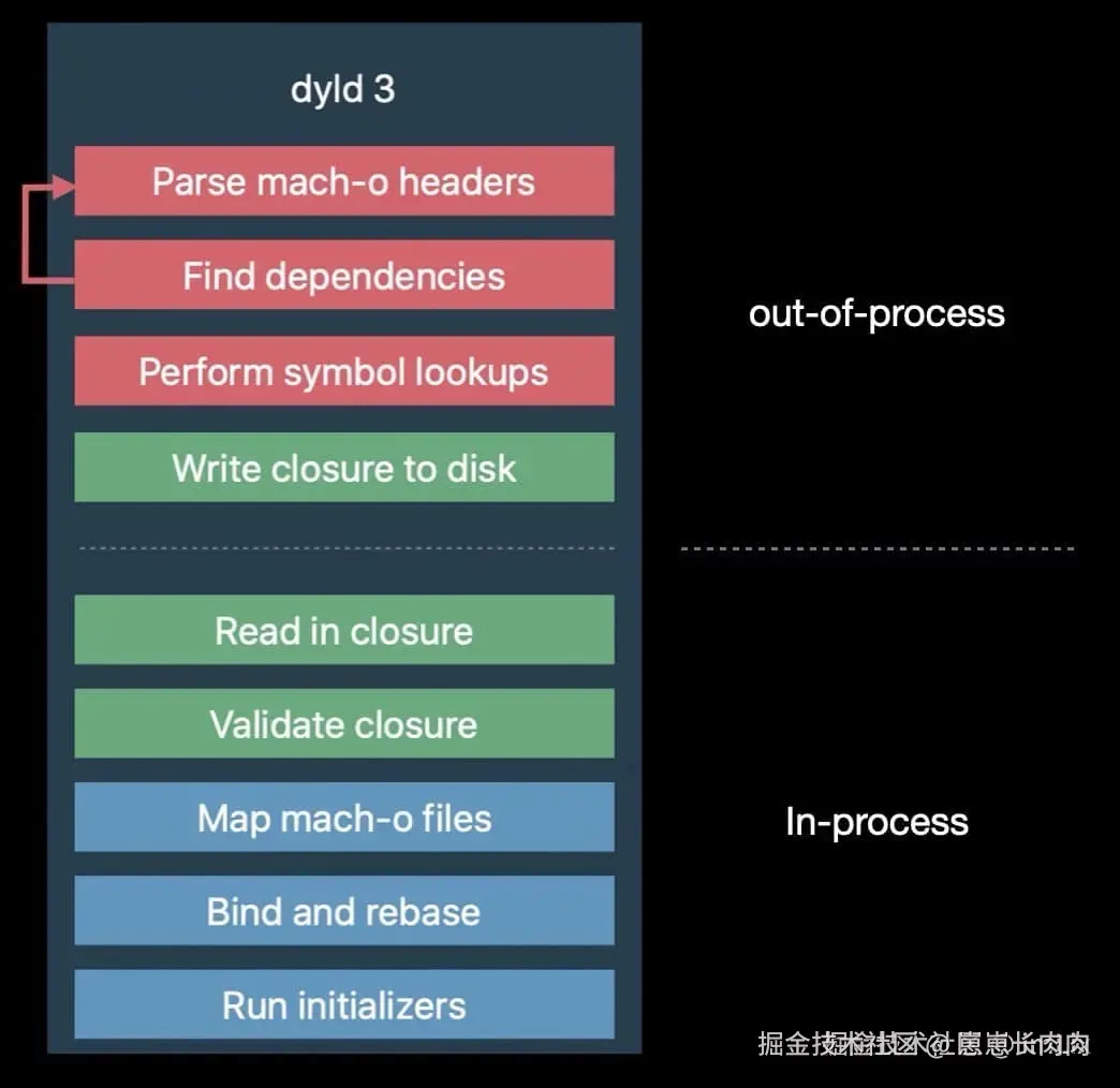 iOS 13 开始 Apple 对三方 App 启用了 dyld 3,dyld 3 将上面 dyld 2 工作过程的第 (1)、(2)、(3) 这三步在另外一个进程上提前(APP 安装或升级时)处理好了,并且将处理结果保存到启动闭包中,并将闭包存储到磁盘(存储在沙盒的 tmp/com.apple.dyld 目录)中。