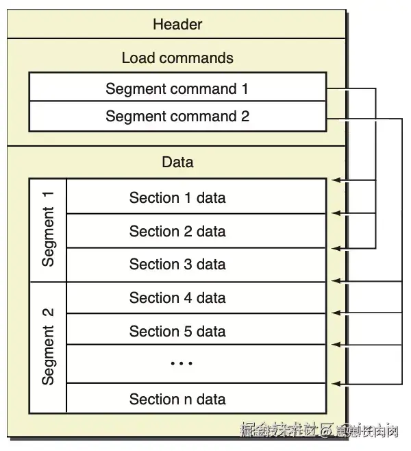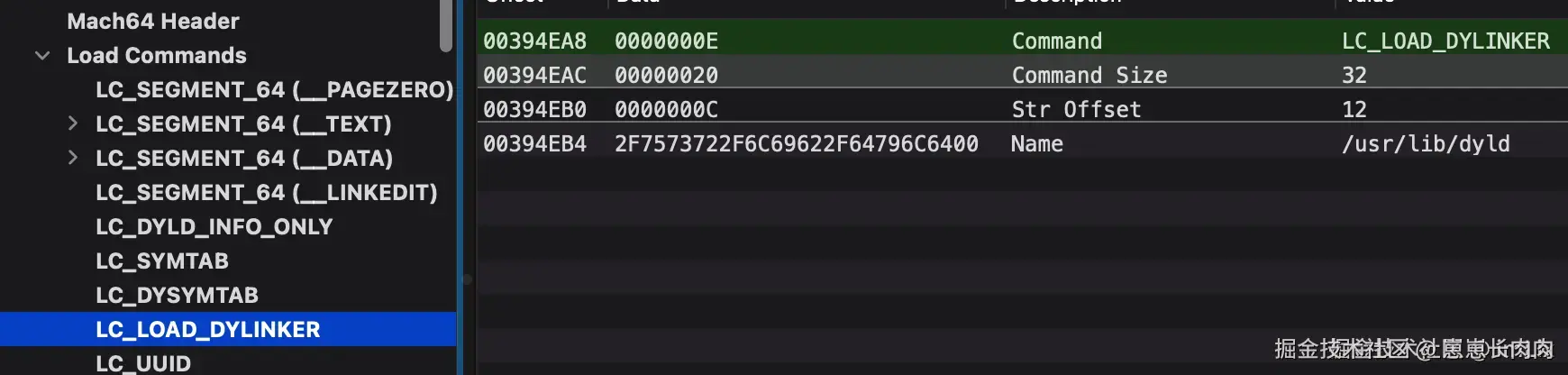 Load Commands 即加载命令,又称指令。这些命令在被调用时清晰地指导了如何设置并加载二进制数据。有一些命令是由内核加载器直接使用的,其他命令是由动态链接器(dyld)处理的。其中 LC_LOAD_DYLINKER 命令中存储了动态链接器(dyld)的路径信息。