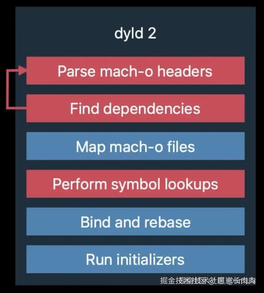 dyld 全名 The dynamic link editor,即动态链接器,是 iOS & Mac OS 系统的重要组成部分。在内核将 APP 的主 Mach-O 文件和 dyld 加载完成后,后续的流程将交由 dyld 来完成。dyld 是 in-process 的,也就是在我们 APP 的进程里工作的。dyld 负责解析 Mach-O 的 Header, 得到所依赖的 dylib(动态链接库),通过递归的方式把全部需要的 dylib 都加载进来。