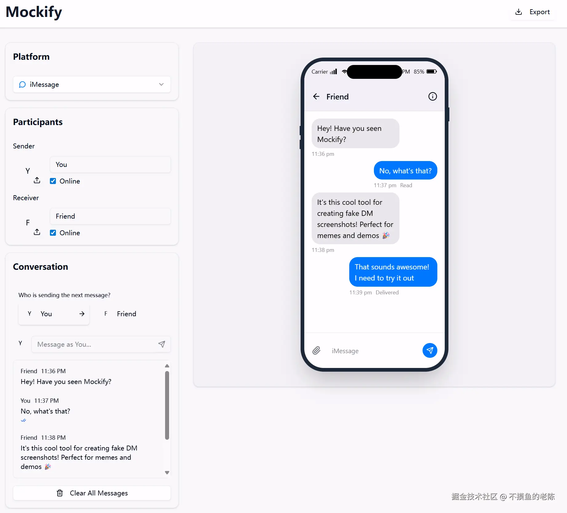 Mockify是一款开源的即时消息模拟工具,能够创建来自消息平台的假消息,支持自定义外观,且无水印,方便开发者使用。