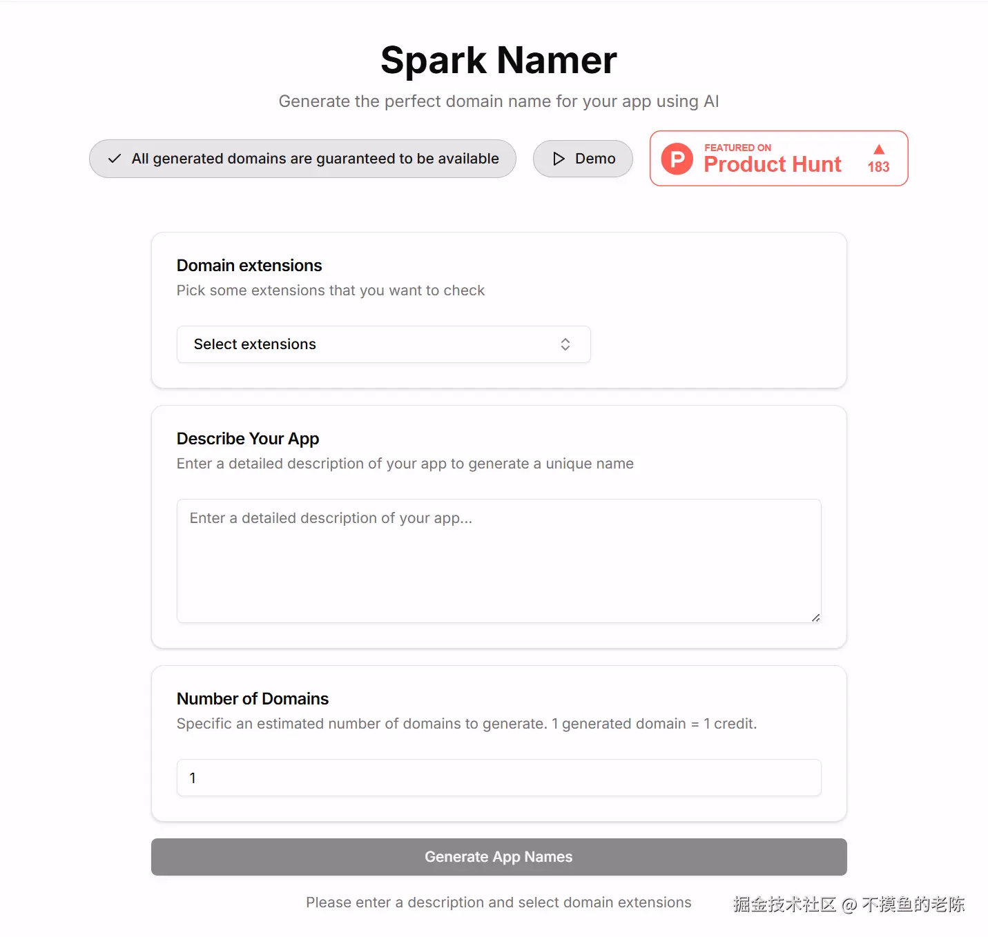 Spark Namer是一款免费工具,帮助创业者快速生成可用且有吸引力的域名,并支持多平台检查和多种域名后缀选项。