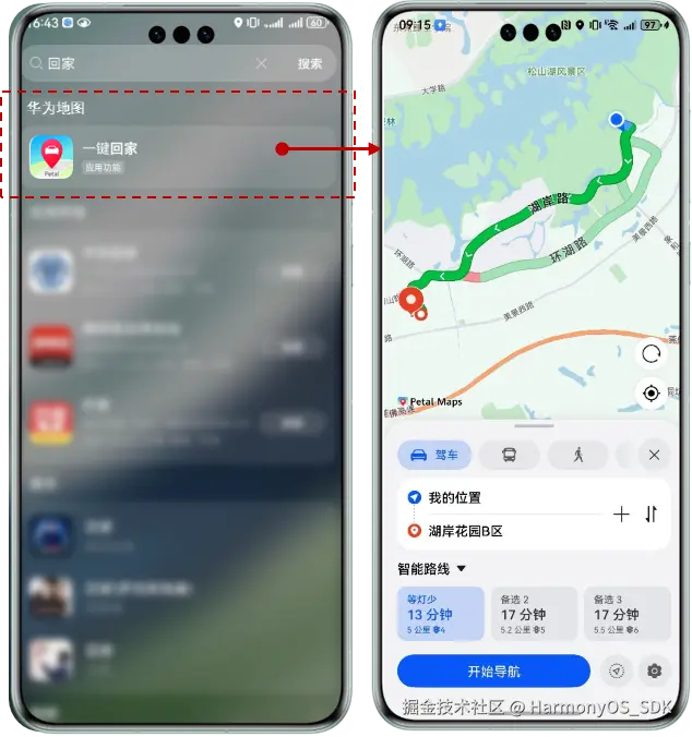 开发者将应用内的功能声明接入意图框架后,在小艺搜索入口,搜索对应功能名或者应用名,可以将应用内功能直接搜出,比如地图应用声明"查路线"功能后,可通过搜索应用名或功能名搜出具体功能,点击后直接拉起应用中的功能页面。