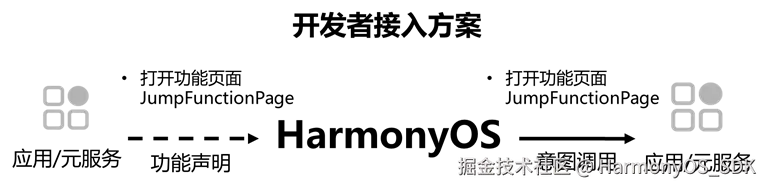 HarmonyOS SDK 意图框架服务(Intents Kit)提供技能调用方案中的功能一步达能力和功能搜索方案;技能调用是意图框架依托系统AI多模态大模型能力做深度用户输入理解,并通过解析的用户意图对接应用或元服务内的功能和内容。其中功能一步达可通过小艺帮助用户快捷打开应用内功能,实现一步直达,功能可由开发者自定义批量声明。开发者将应用/元服务内的功能和内容通过意图框架注册到HarmonyOS,即可实现"一步搜索,内容直达"。