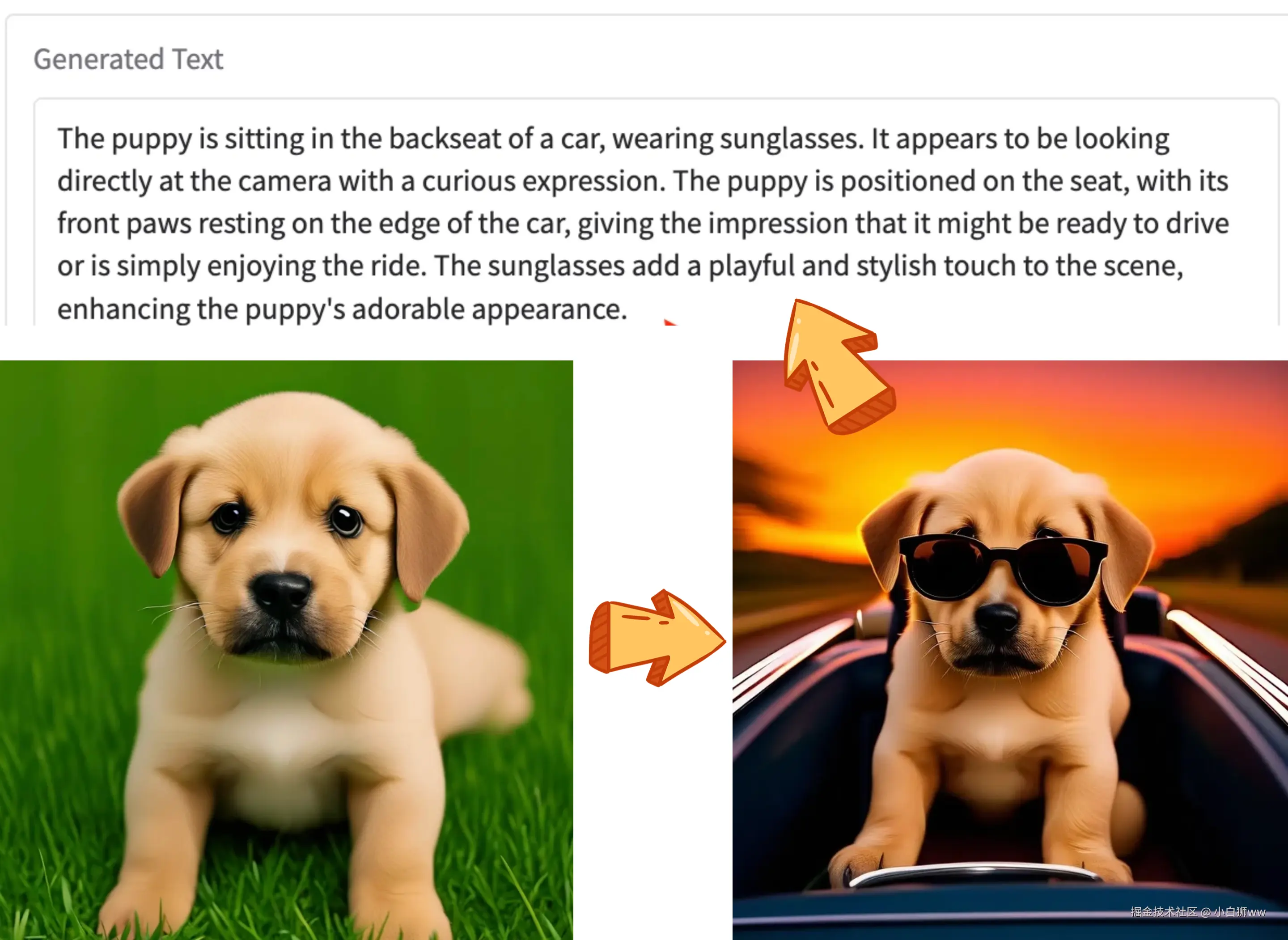 接着对这张图片进行编辑,保存图片,点击「Image + Text → Image」,输入 Prompt「The puppy wearing sunglasses sits in a convertible, speeding down the road. The background is a sunset glow.」,模型很快给出了我们想要的效果,后面是晚霞,带着墨镜的小狗坐在敞篷车里。