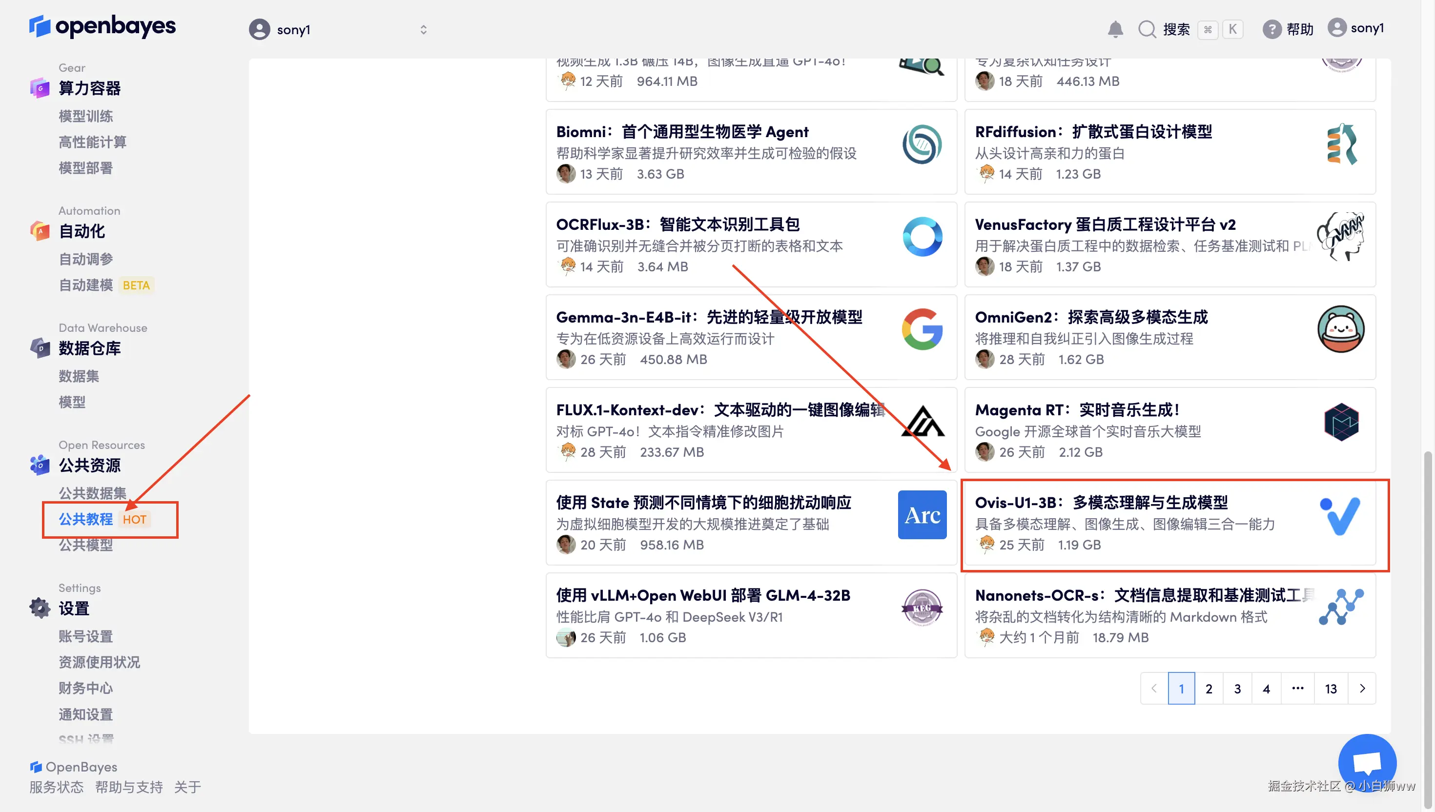 首先点击「公共教程」,在公共教程中找到「Ovis-U1-3B:多模态理解与生成模型」,单击打开。