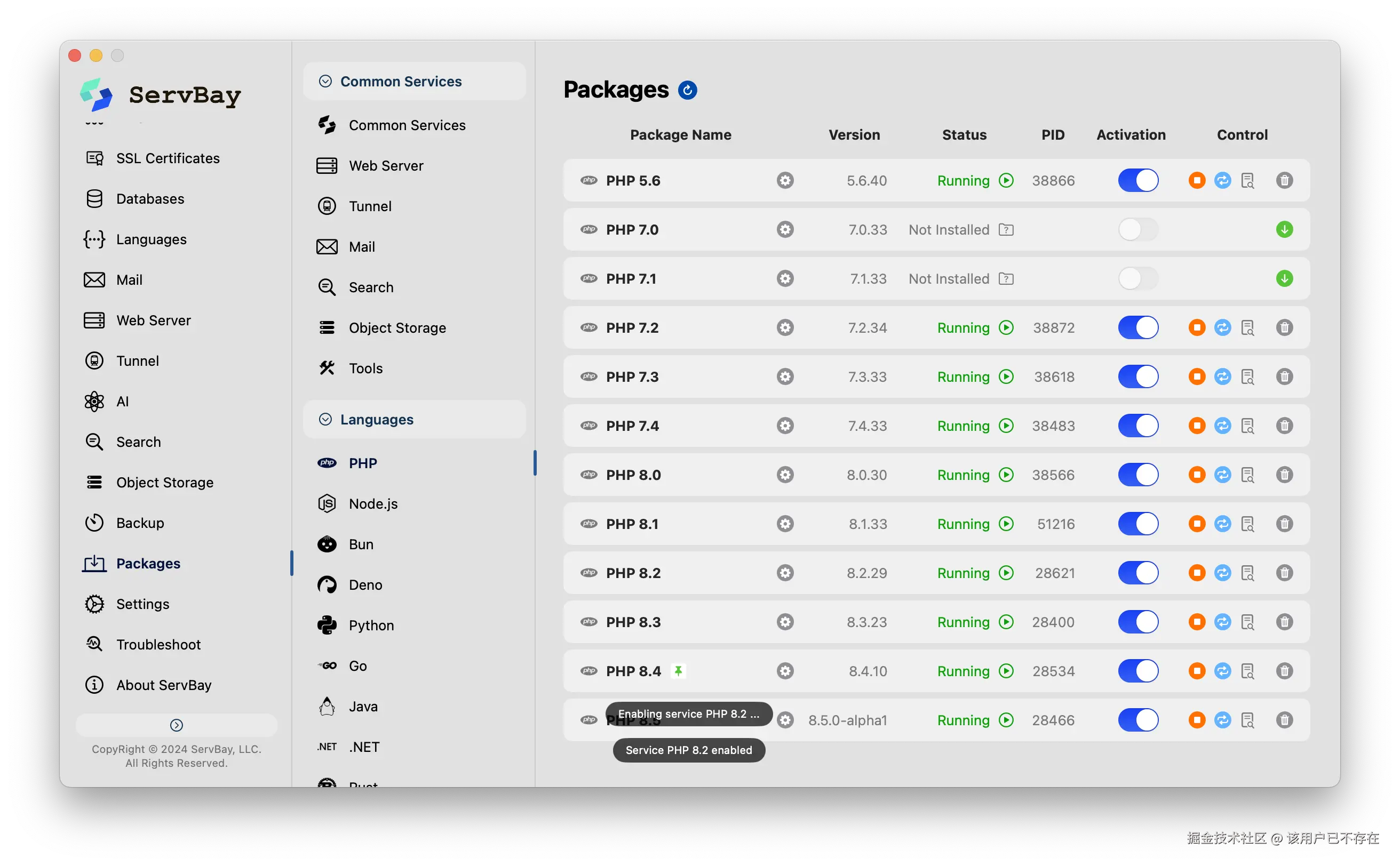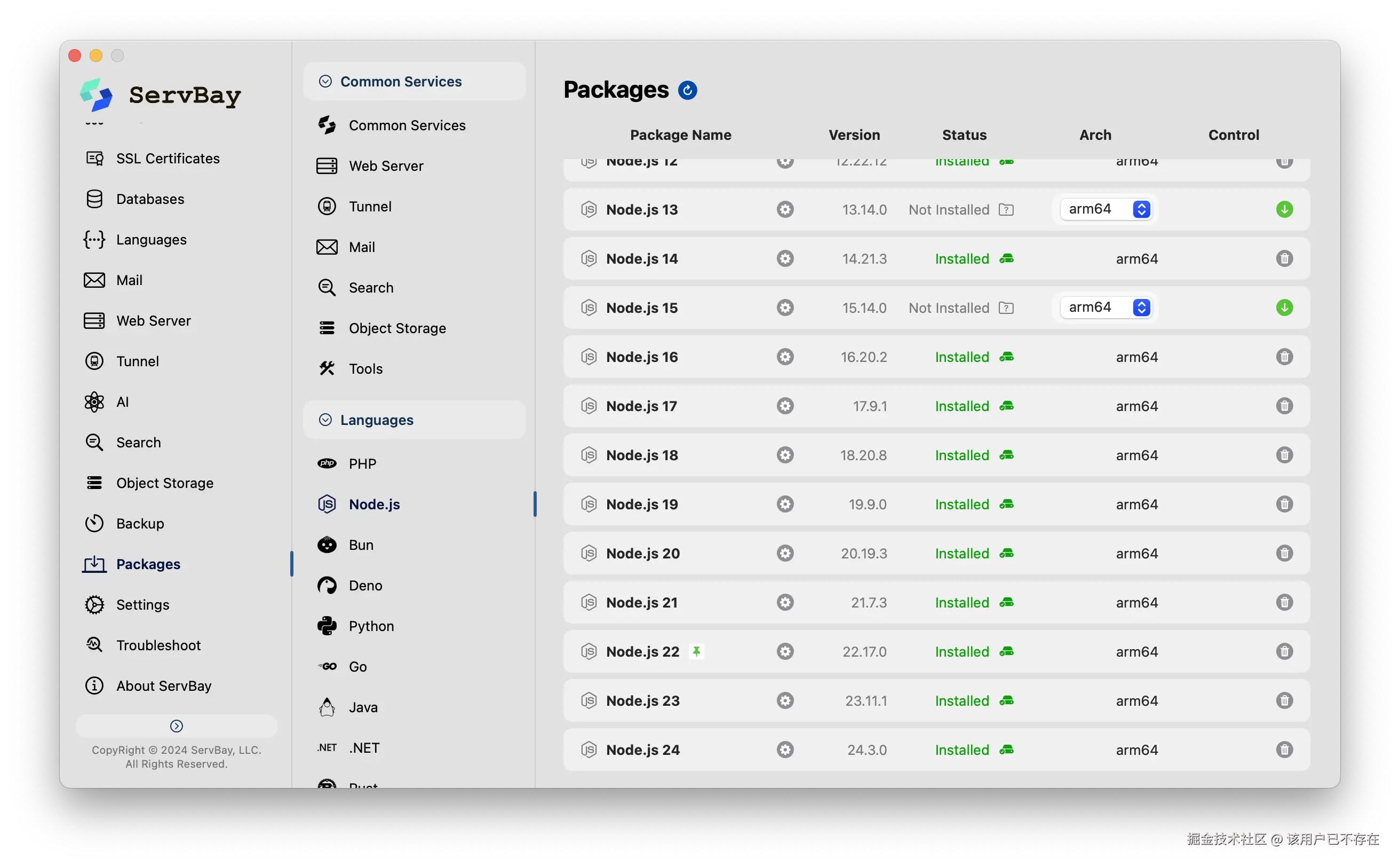 有了ServBay,开发者就可以告别手动配置了, 因为它可以一键安装和管理多个版本的 PHP、Node.js,甚至 Python、Java,并且内置了高性能的 Web 服务器,集成了主流数据库,连本地开发的 SSL 证书都帮一键搞定。只需要用鼠标,就能搭建好一个干净、隔离、随时可以切换的开发环境,一行命令都不需要输入。