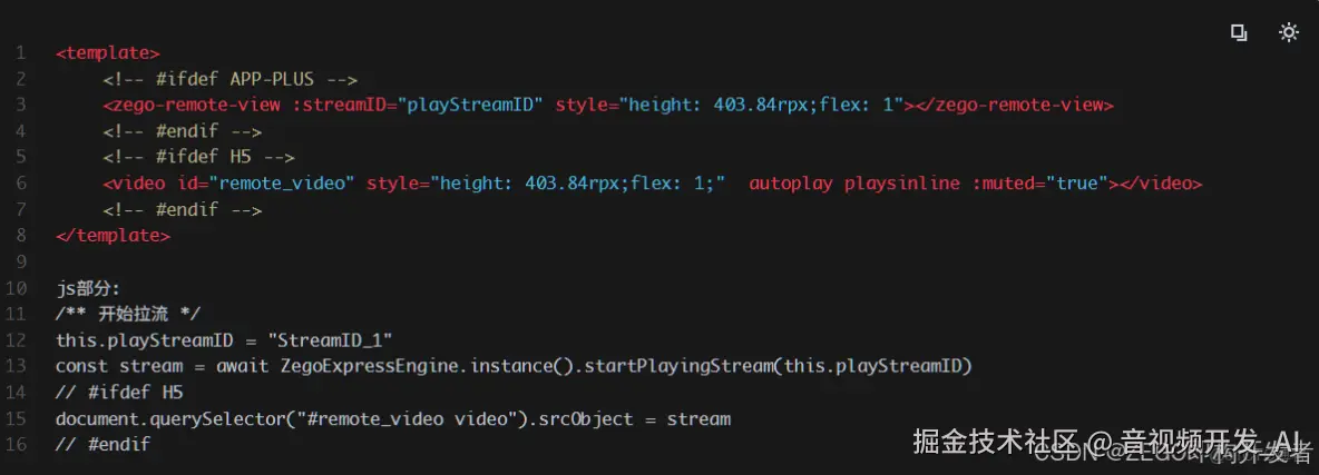 在 uni-app 的 Web 环境中,若 startPlayingStream 调用成功,会返回一个 MediaStream 对象,开发者可以用返回的 MediaStream 赋值给 video 元素的 srcObject 属性设置远端视频流视图。