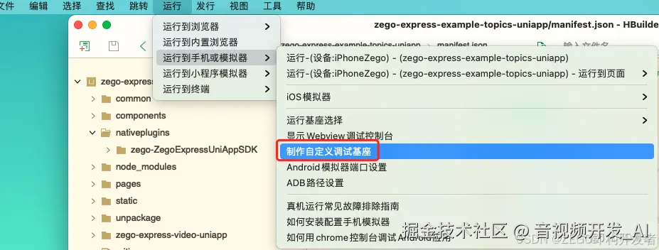 选择“运行 > 运行到手机或模拟器 > 制作自定义调试基座”菜单。