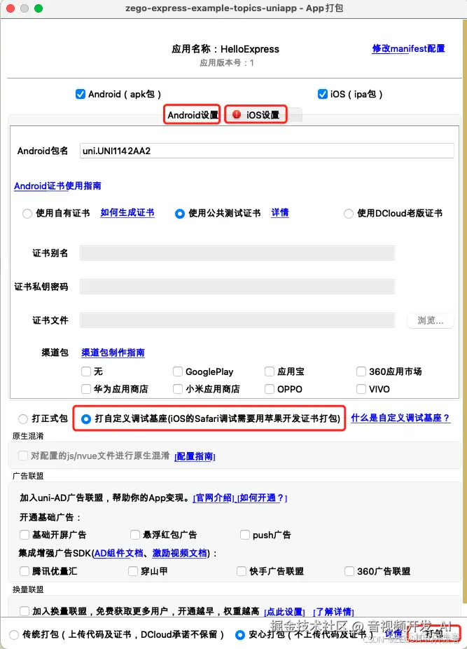 在弹出的界面中,按照 uni-app 教程,填写相关信息,并单击“打包”进行云打包。