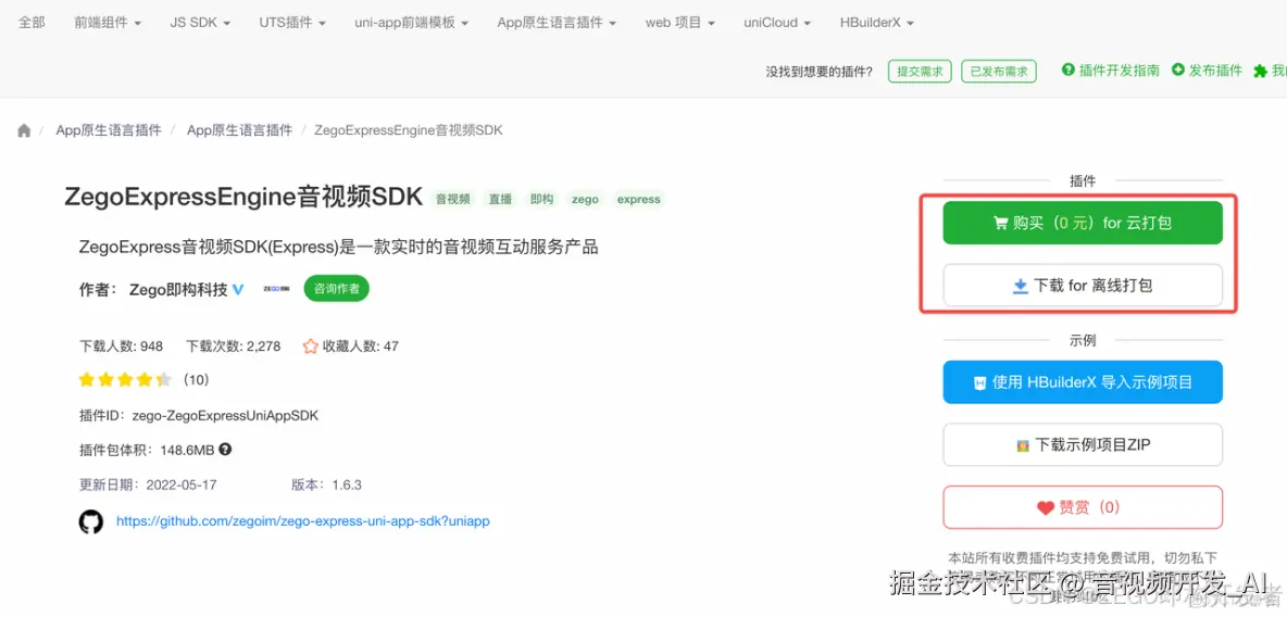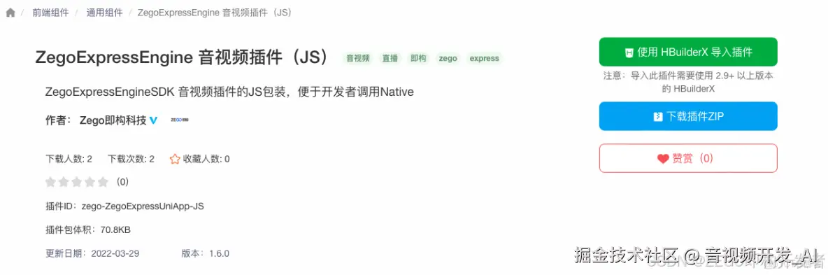 在插件市场的 ZegoExpressEngine 音视频插件(JS)