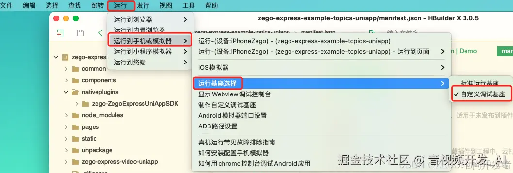 打包步骤完成后,选择“运行 > 运行到手机或模拟器 > 运行基座选择 > 自定义调试基座”。