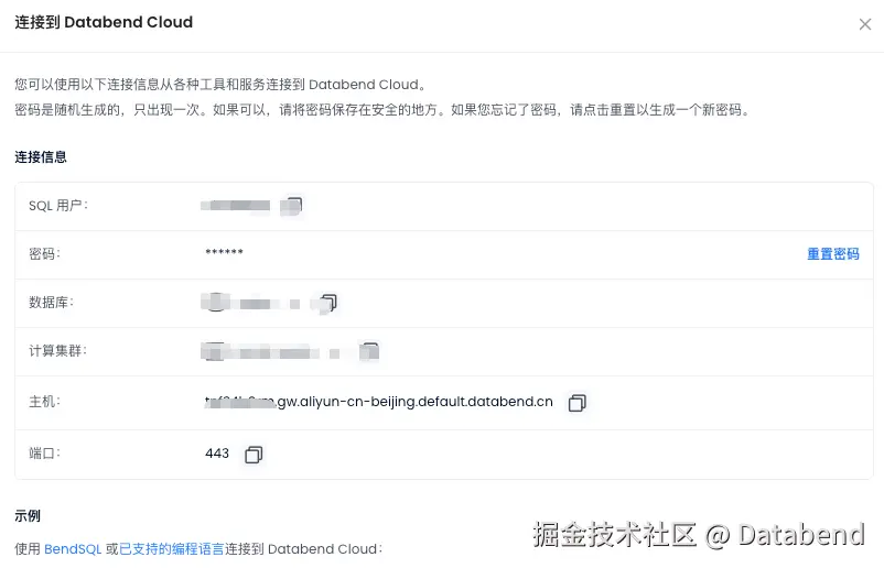 例如这里获取的为: 租户名.gw.aliyun-cn-beijing.default.databend.cn 补全一个 DSN 为: https://wubx:password@租户名.gw.aliyun-cn-beijing.default.databend.cn/wubx?warehouse=small-wubx