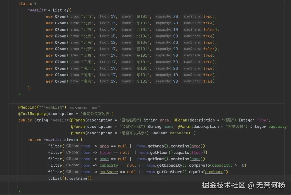比如这里有一个查询会议室的mcp server,设置了如下这些参数,还有筛选(这里的筛选相当不严谨,只是demo,将就一下吧)