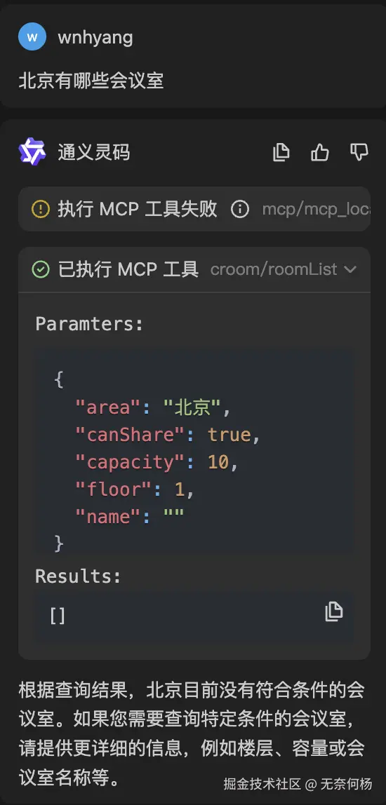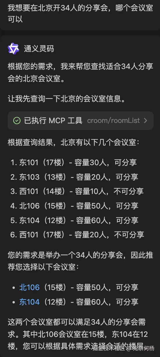我仅仅只是问“北京”的会议室,AI却意外根据MCP Server工具的参数描述意外的提取了额外的参数,而且这些参数是毫无根据的,楼层1?容量10?哪里来的,这不是乱讲吗?