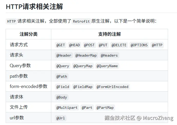 - 如果你不太明白这些注解是干嘛的,看下下面的表基本就懂了,更具体的话可以参考Retrofit官方文档;