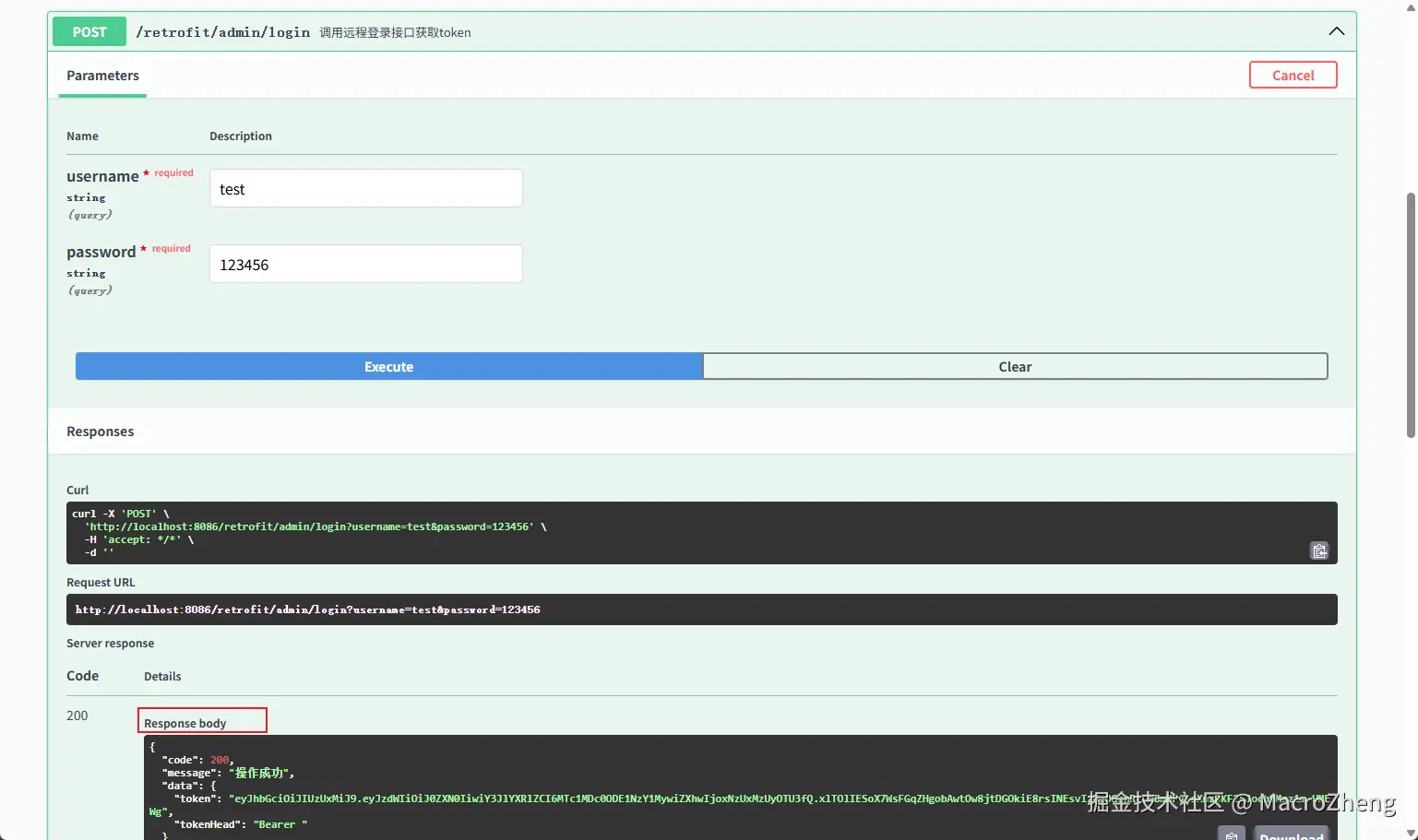 - 接下来通过Swagger进行测试,调用接口就可以获取到远程服务返回的token了,访问地址:http://localhost:8086/swagger-ui/index.html