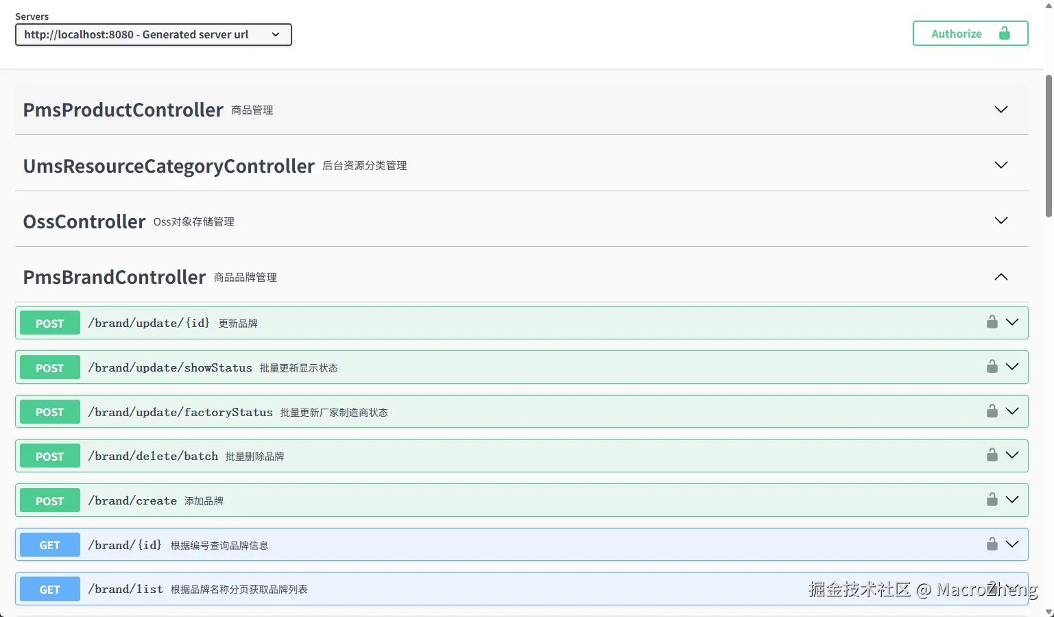 mall-admin给运行起来,这里我们会调用其中的登录接口和商品品牌管理接口,可以打开API文档查看下:http://localhost:8080/swagger-ui/index.html