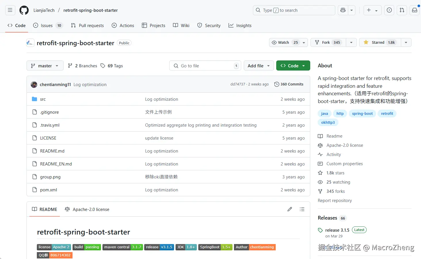 Spring Boot是使用最广泛的Java开发框架,但是Retrofit官方并没有提供专门的Starter。于是有位老哥就开发了retrofit-spring-boot-starter,它实现了Retrofit与Spring Boot框架的快速整合,并且支持了诸多功能增强,极大简化开发。今天我们将使用这个第三方Starter来操作Retrofit。
