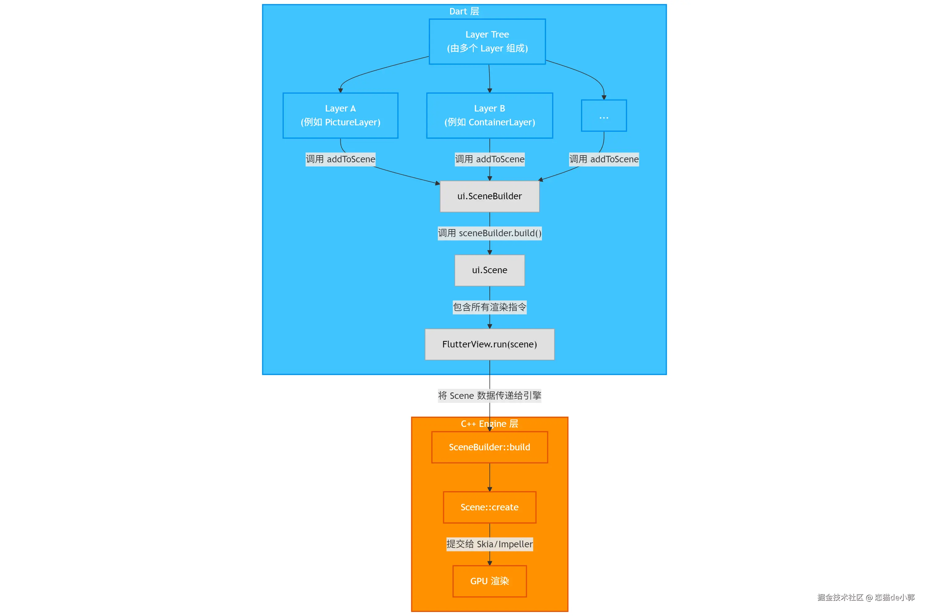 所以如下图所示,一般来说 Dart 层的 Layer 不会直接操作 Scene ,而是通过统一基类的 addToScene 方法来操作 SceneBuilder , 例如 Dart 层的 ClipPathLayer 会在它实现的 addToScene(ui.SceneBuilder builder) 调用 builder.pushClipPath 来得到一个 ClipPathEngineLayer,而所有 Dart Layer 最终会通过 sceneBuilder.build() 统一提交到 C++ :