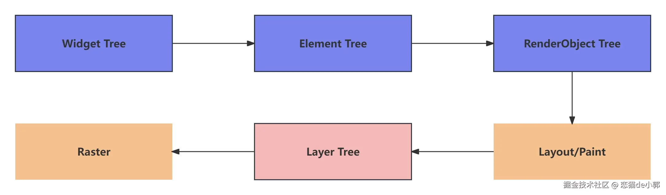 众所周知,Flutter 最被人熟知的就是 Widget - Element - RenderObject 这三棵树,而实际上如下图所示,在 paint 阶段,RenderObject 并不直接执行真正的绘制操作,而是会创建和配置相应的 Layer 对象,例如 PictureLayer :